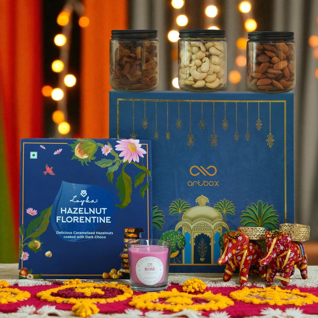 Illuminate your celebrations with elegance and charm! This beautifully curated hamper includes: 1. Dry Fruits...