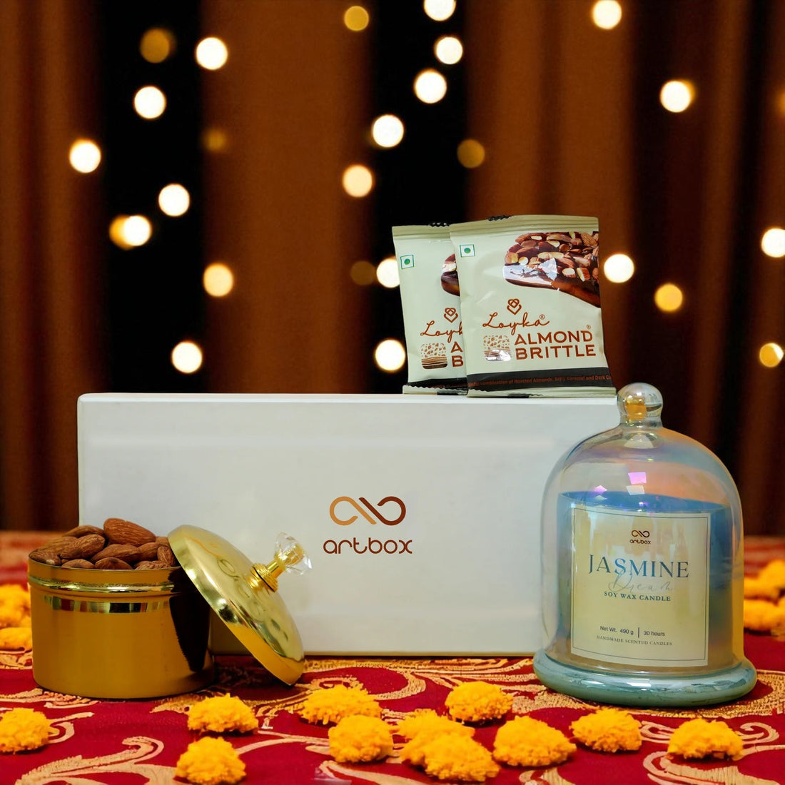 Illuminate your celebrations with elegance and charm! This beautifully curated hamper includes: 1. Bell Jar...