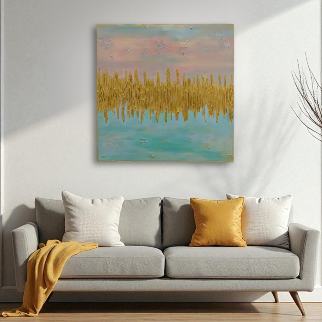 This handmade canvas painting features a striking golden textured pattern that resembles shimmering reflections on...