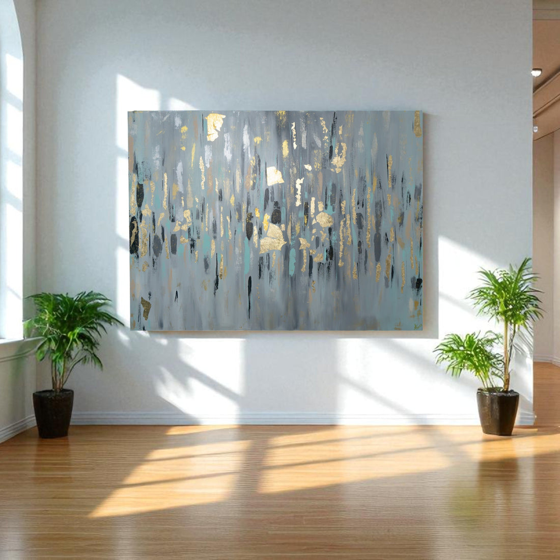This large abstract canvas brings to life a serene symphony of soft greys, muted blues,...