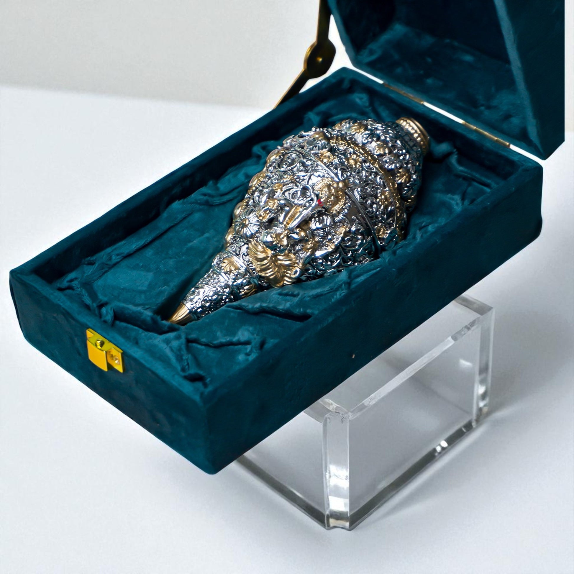 An exquisite conch showpiece, made in metal and finished in silver with antique gold accents, brings elegance to your home. The body is richly detailed with carvings inspired by traditional Indian motifs, giving a royal and regal touch to it.