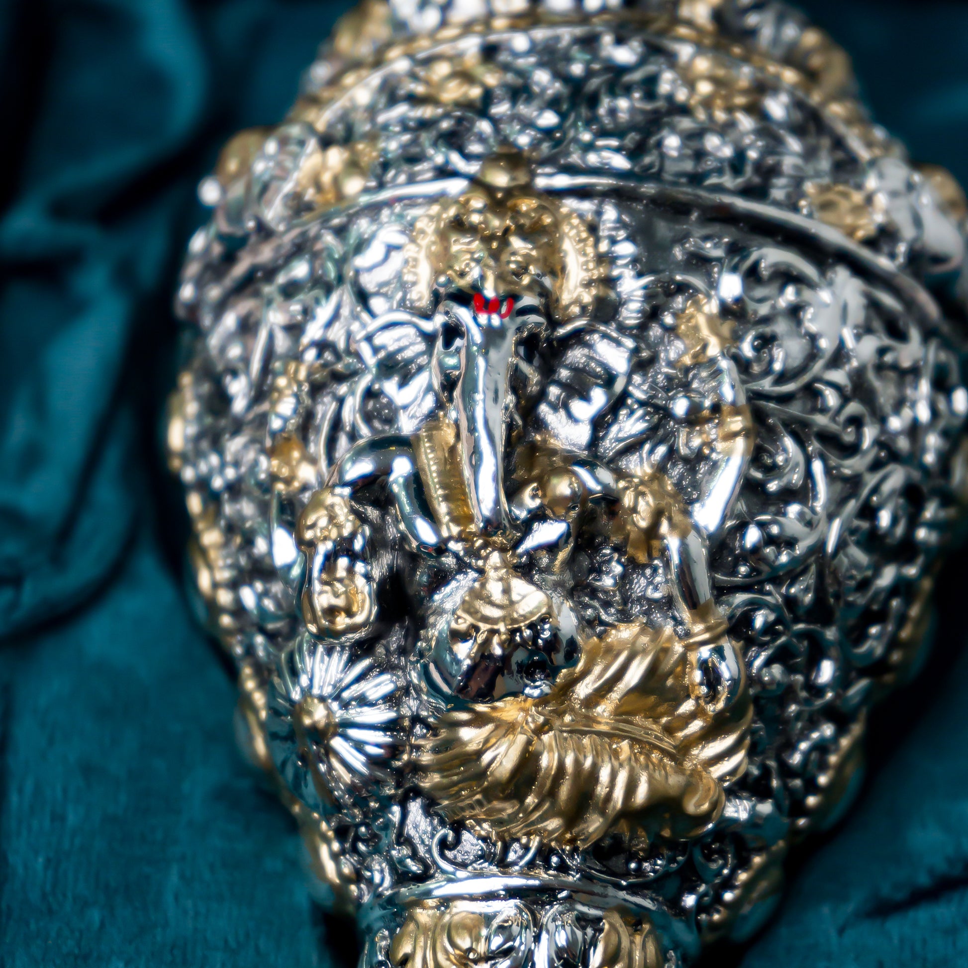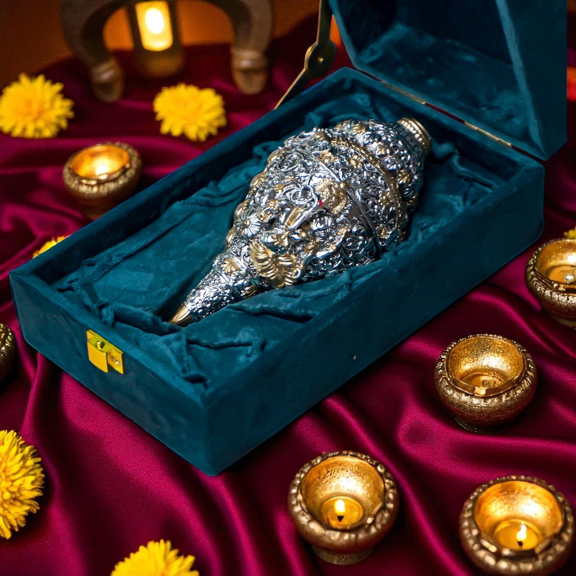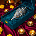 Housed in an opulent deep teal velvet-lined box, the perfect festive gifting option, perfect for housewarmings, or simply a glorious decoration for your pooja room or living space. Whether used as a centrepiece or part of your spiritual décor, it's sure to elicit admiration.