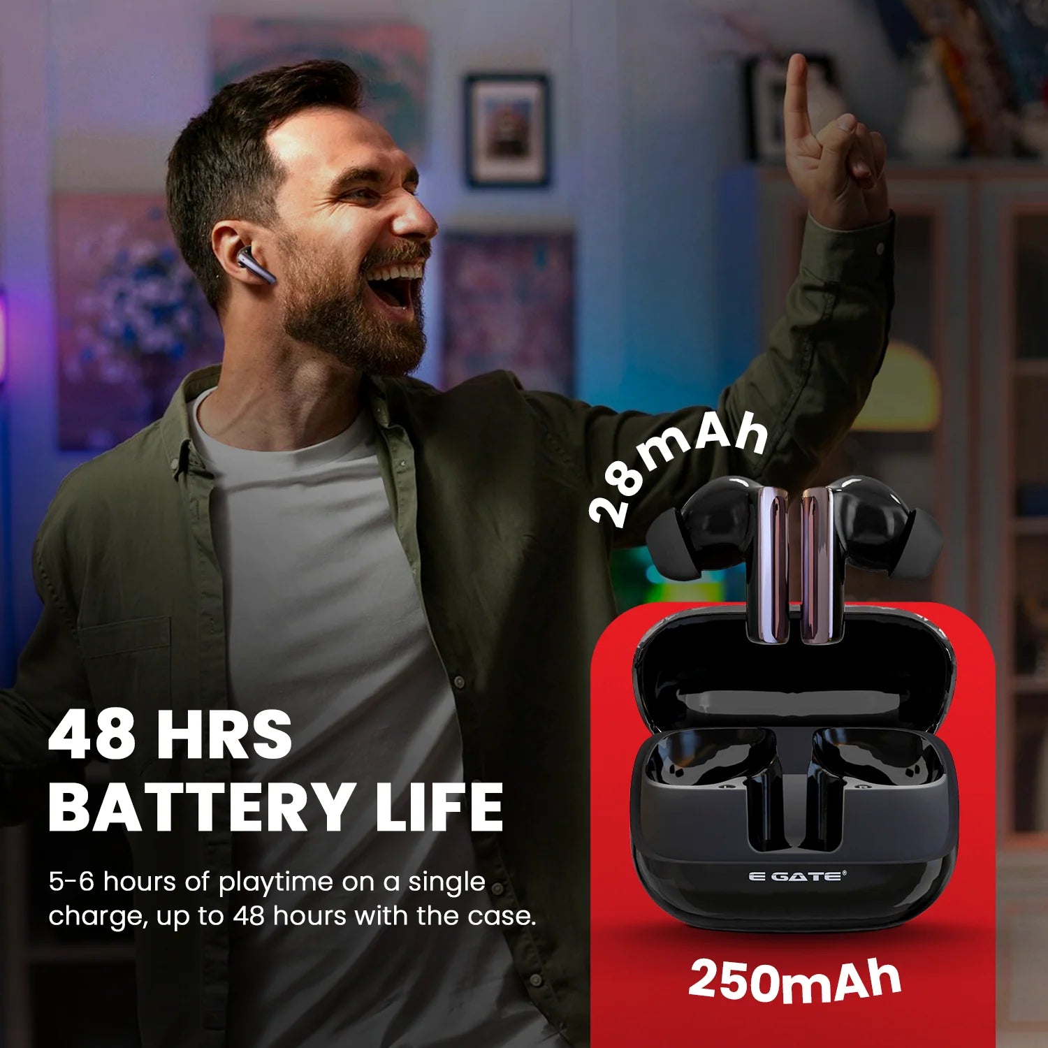 Egate E30 True Wireless Earbuds: Lightweight, powerful, and full of technology. E30 offers quad-mic ENC for crystal-clear individual calls, 10mm titanium drivers for intense bass, and Bluetooth v5.3 for seamless connectivity. The Egate E30 True Wireless Earbuds are the ultimate solution to all your wireless needs. With 48 hours on battery, IPX4 waterproof, and chargeable flash charging, they are the perfect pair to enjoy your music, games, or bring a new style to your everyday talk time.