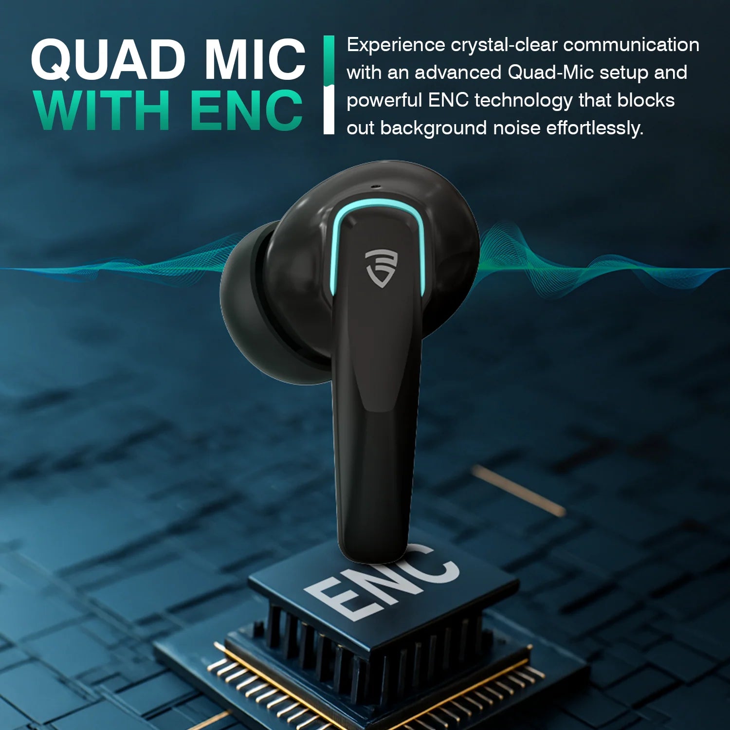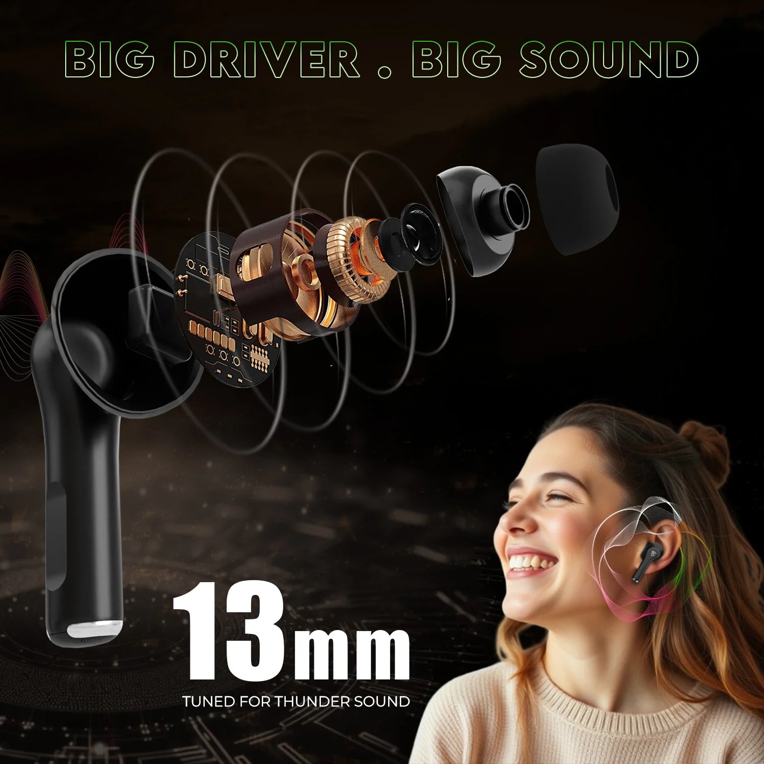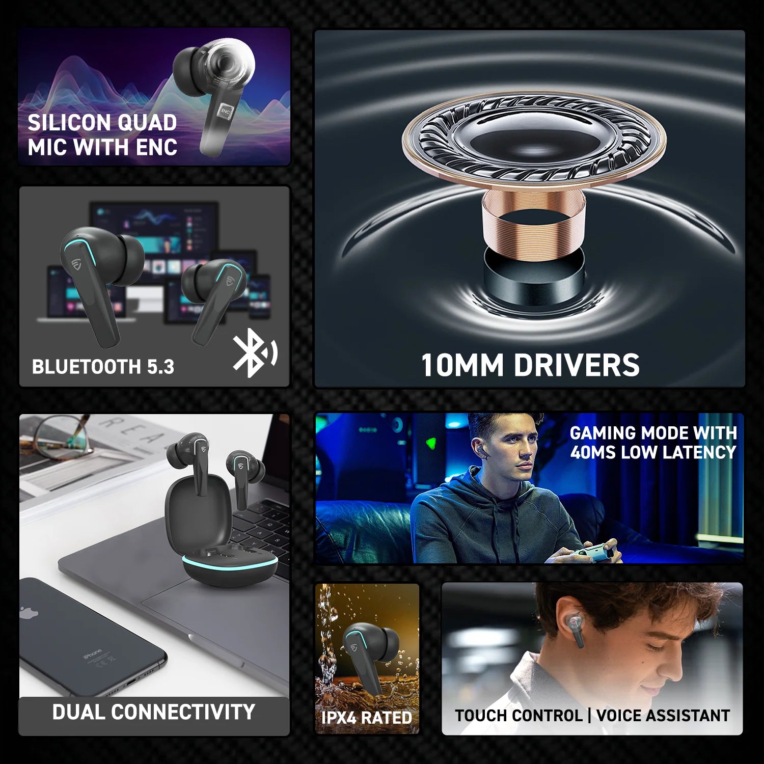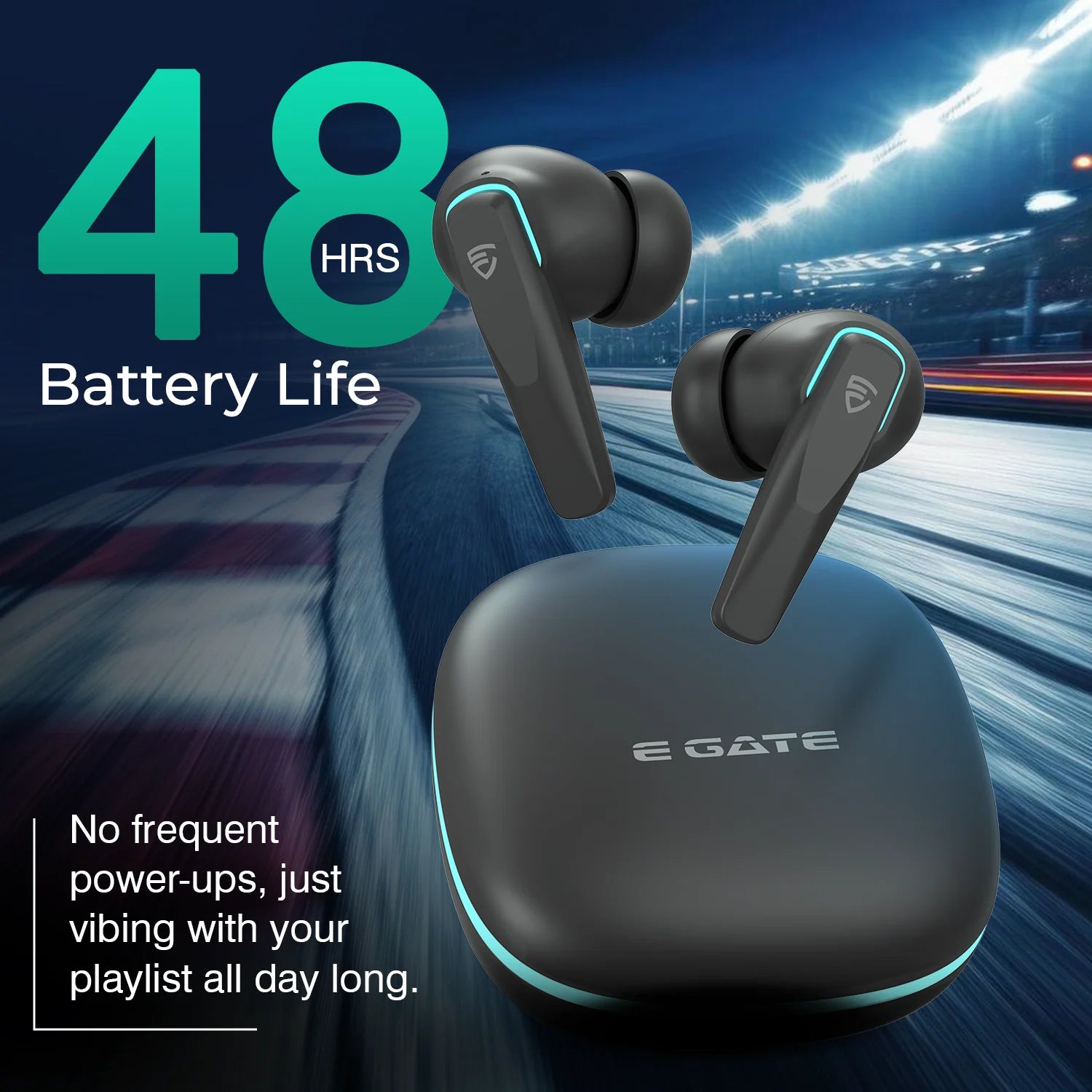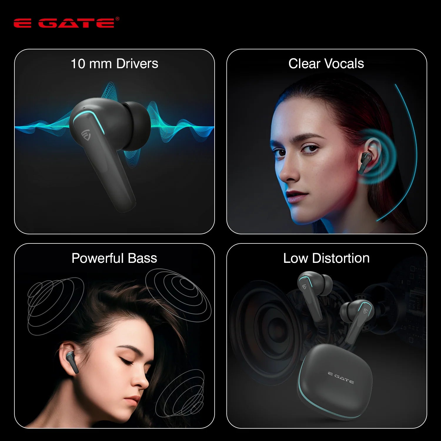 Egate E33 True Wireless Earbuds, With 10mm titanium drivers, the Egate E33 offers a very fun experience with deep bass, strong highs, and immersive sound. The Egate E33 combines aspects for work and fun with quad-mic ENC for noise cancellation during calls, Bluetooth v5.3 for simple pairing, and a low-latency gaming mode to give you the advantage and the edge. 48 hours of playtime, IPX4 for splash resistance, and flash charge to offer you style, comfort, and plenty of fun.