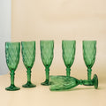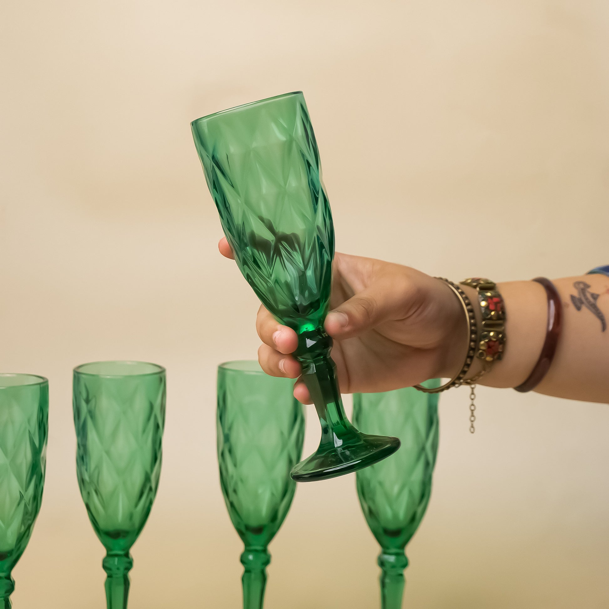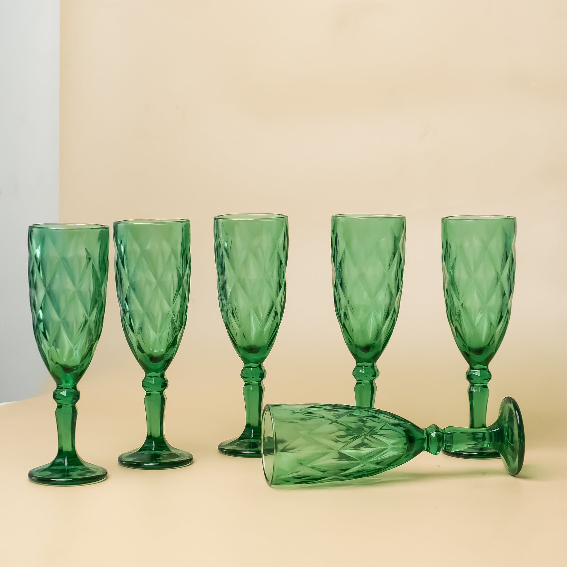 Make your toasts special with this elegant set of six emerald green textured flute glasses. Each glass has a beautiful texture that provides an elegant, angled, tactile, and visual effect! Perfect for champagne, sparkling wine, or cocktails, our brightly-colored contour glasses will fit every celebratory atmosphere vibrantly and exquisitely