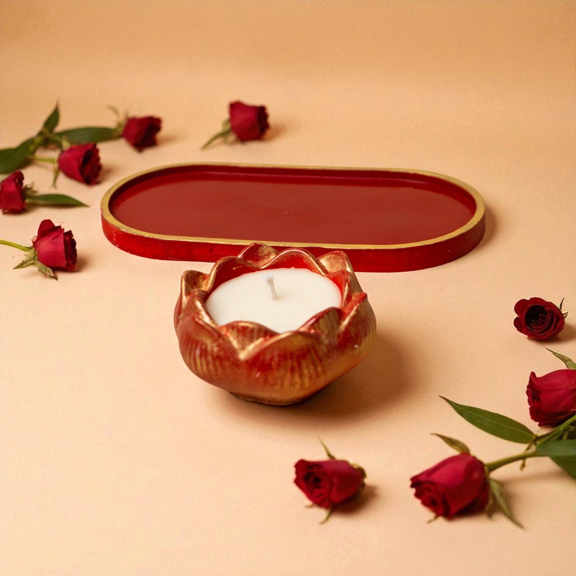 Brighten your life with this beautiful lotus-shaped scented candle in a luxurious red and gold ceramic holder. What better way to symbolize purity, peace, and joy than with the very floral design of a lotus, to embody the feeling of luxury warmth for everyday use, or festive occasions. This hand-poured candle, made with premium wax, is uniquely designed to bring a clean, even burn while gently aromatizing your home with a beautiful scent.