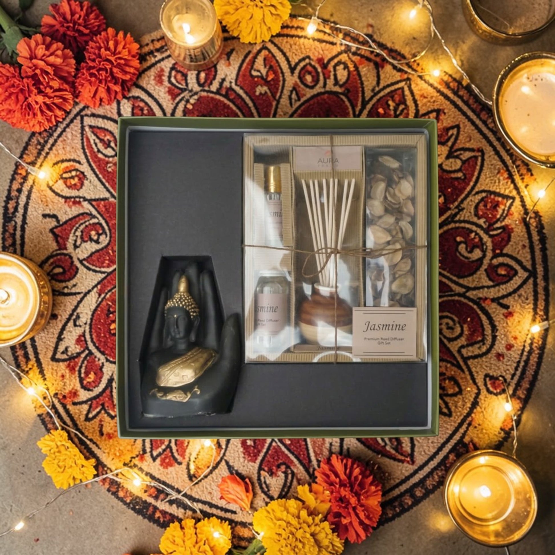 Infused with the soothing essence of jasmine fragrance, this box is designed to refresh your space while adding a touch of serenity. The beautifully crafted Buddha idol symbolizes peace and mindfulness, making it not just a gift—but an experience of relaxation and harmony.