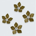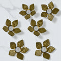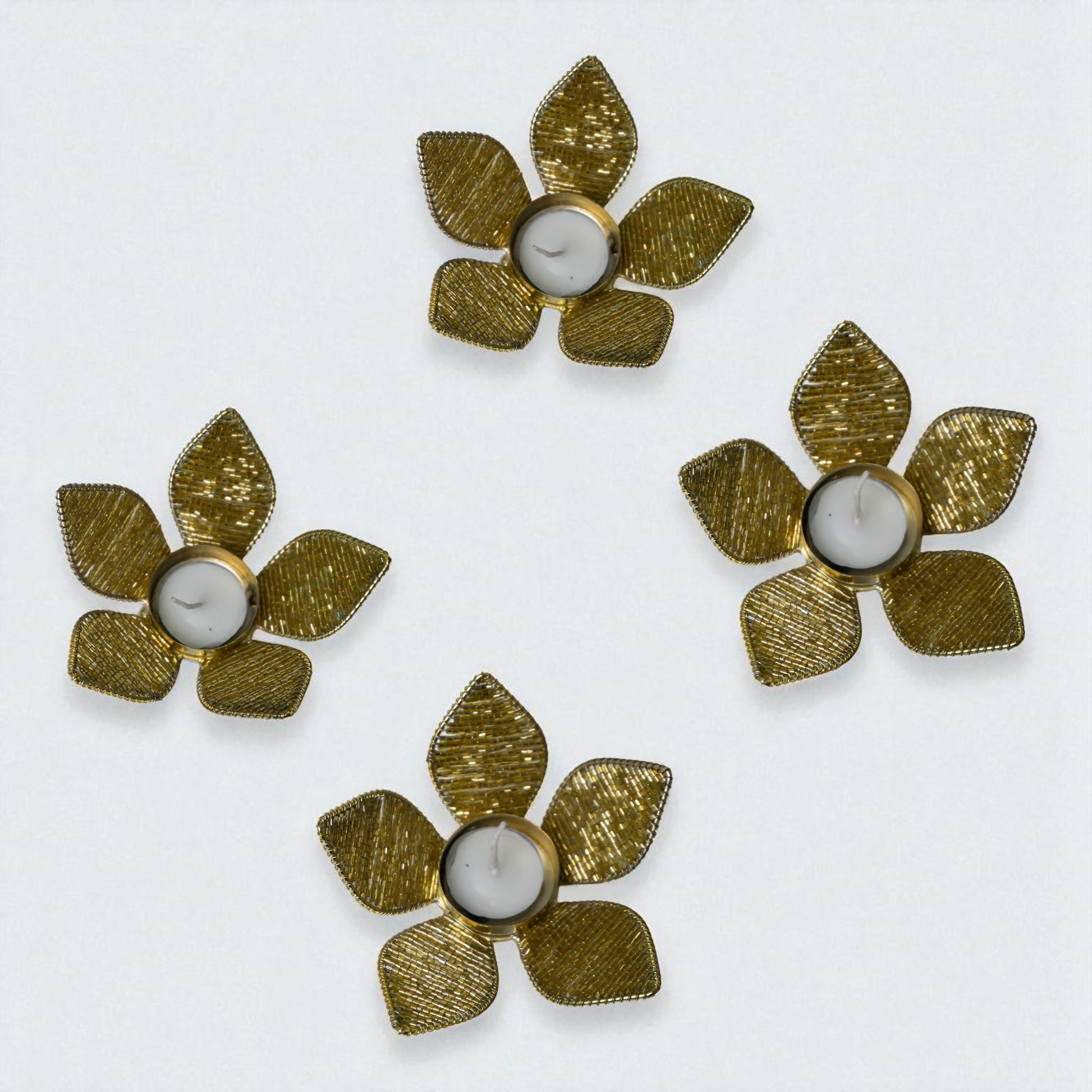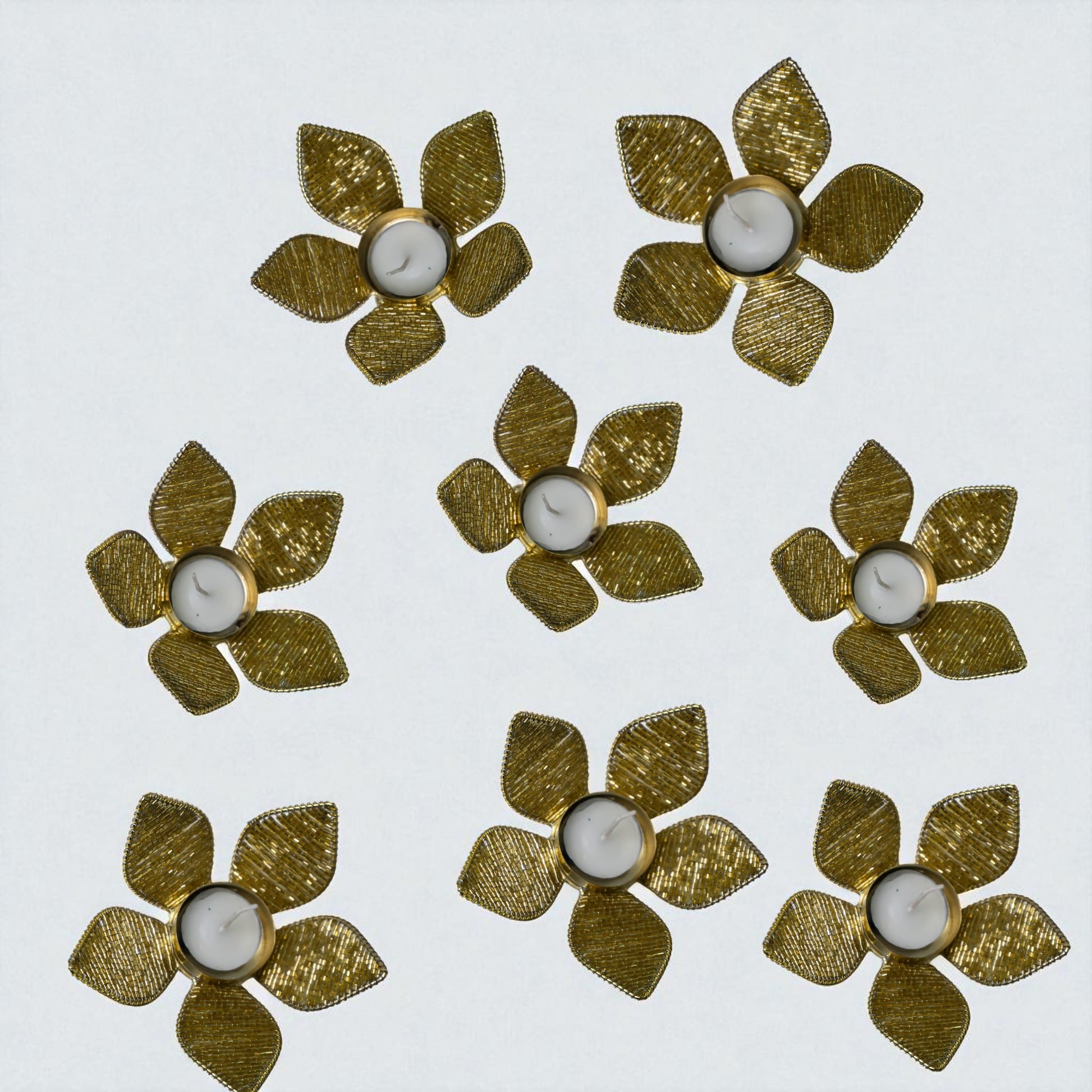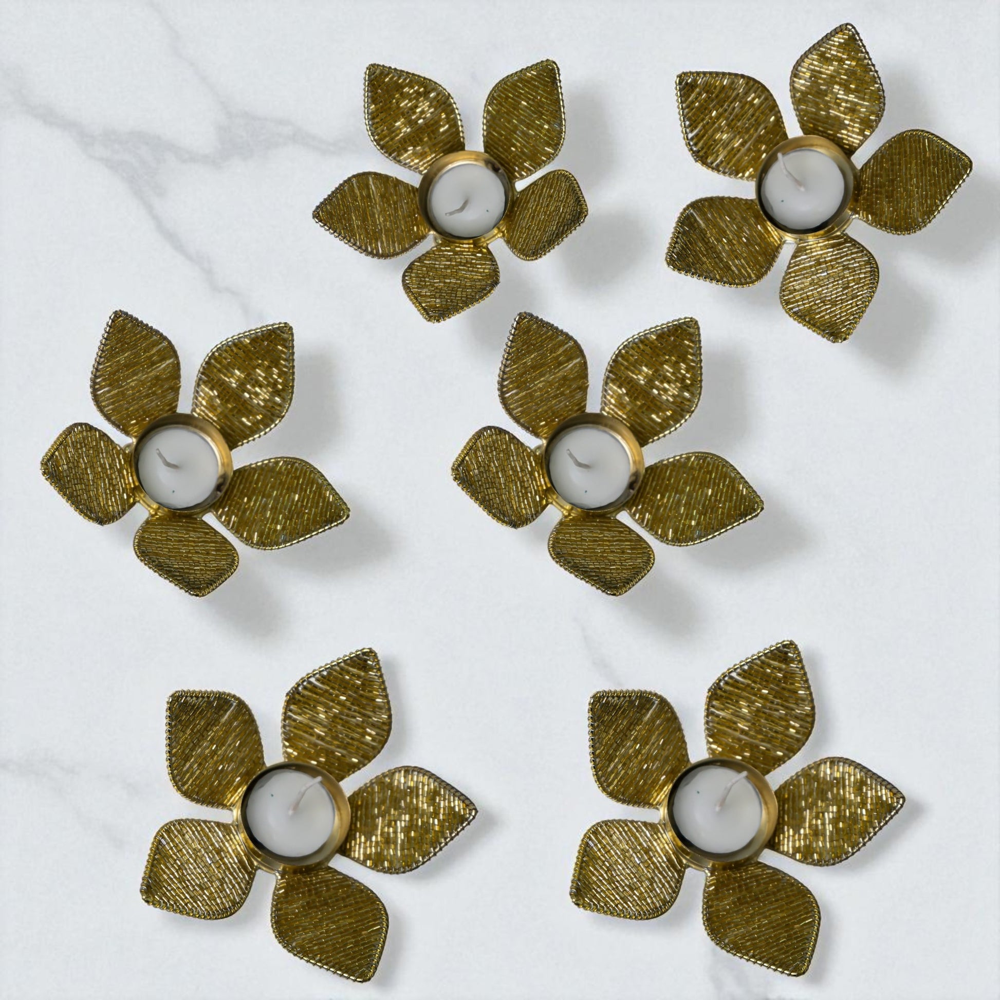 Bring out an element of royalty to your festive decor with the "Gold Leaf T-Light Holder," embracing a traditional aesthetic with a modern twist. Shaped like a flower in bloom, this decorative piece has five leaves pointing upwards, wrapped in exquisite gold halo beads to reflect light exquisitely. All of the petals are embellished with detailed fine gold beadwork that gives it a curated feel and modern sparkle. This holder is made of a lightweight yet sturdy material and can serve as a key decorative centerpiece, a pooja decor, or in festive rangoli decor. When you light a candle in this holder, the tone and bead characteristics combine to create a beautiful radiance, perfect for occasions of significance like Diwali, weddings, housewarmings, and everyday decor.