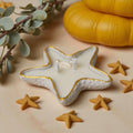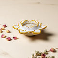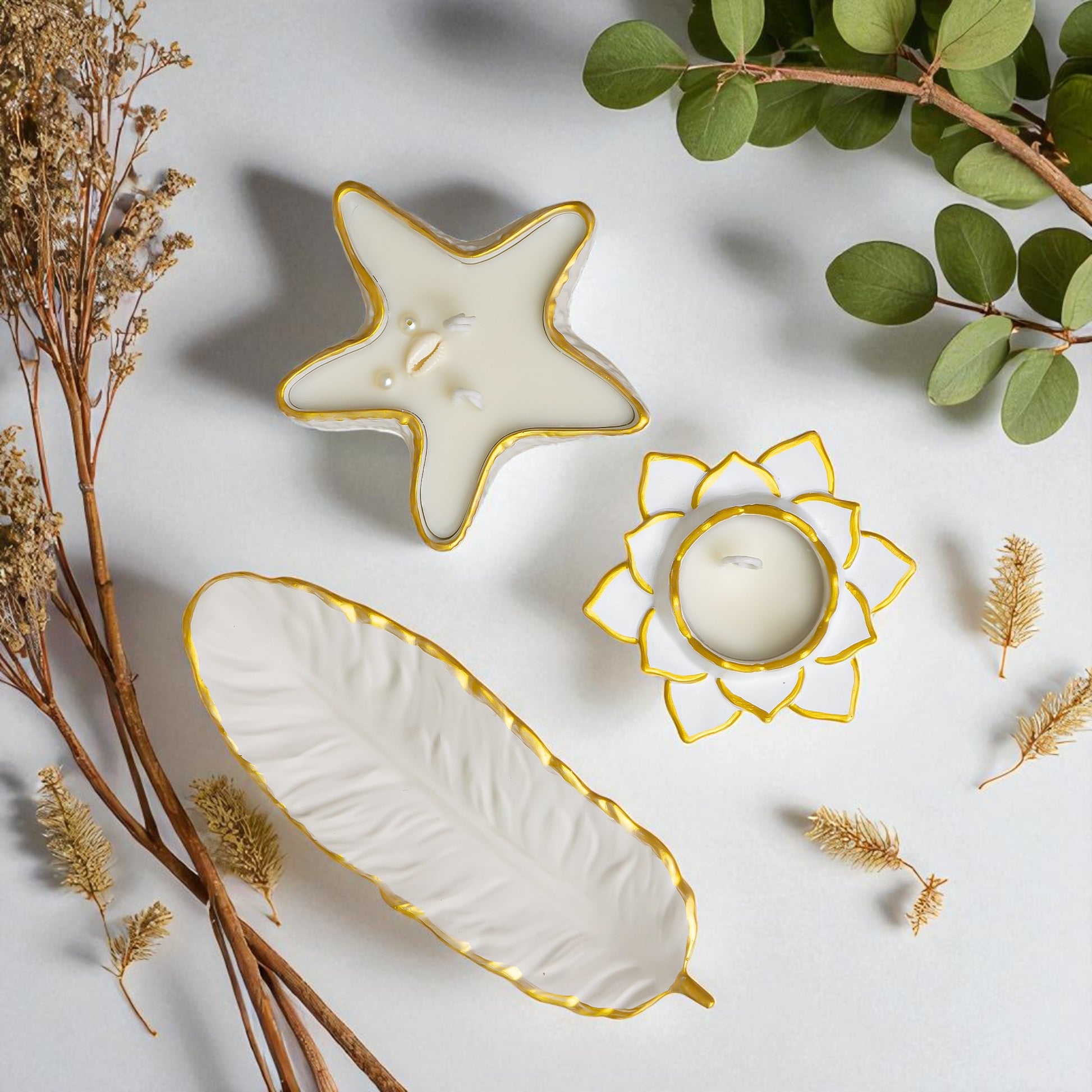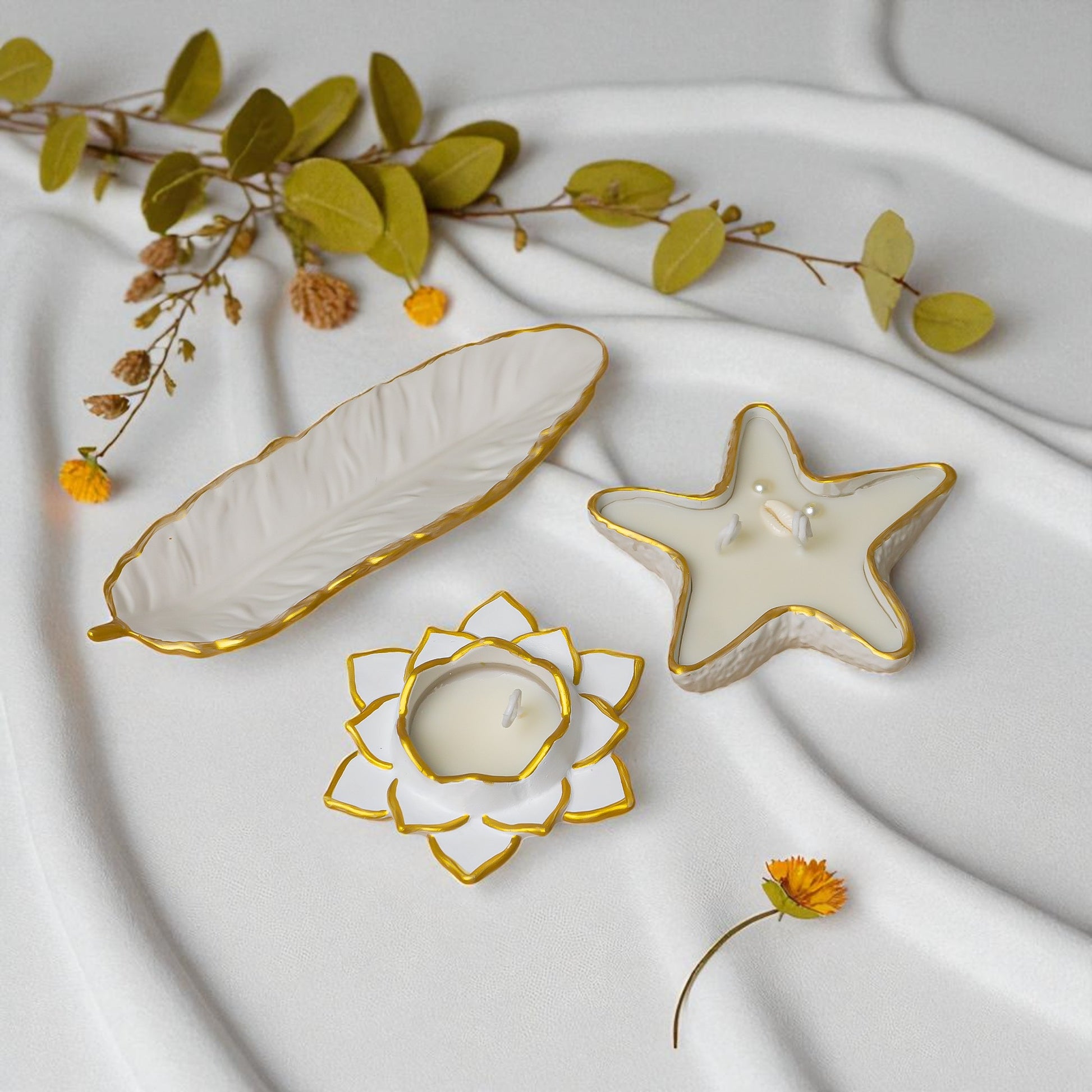 With the festive season right around the corner, proudly present the Golden Glow Ceramic Hamper for gifting season. This hamper features a handcrafted ceramic tray shaped like a long leaf with two intricately designed candles, which are shaped like a lotus and a starfish. Both candles come with underscored gold accents. The Golden Glow Hamper offers rustic charm with stylish sophistication. Use it as a gift for Diwali or as statement decor for your home.