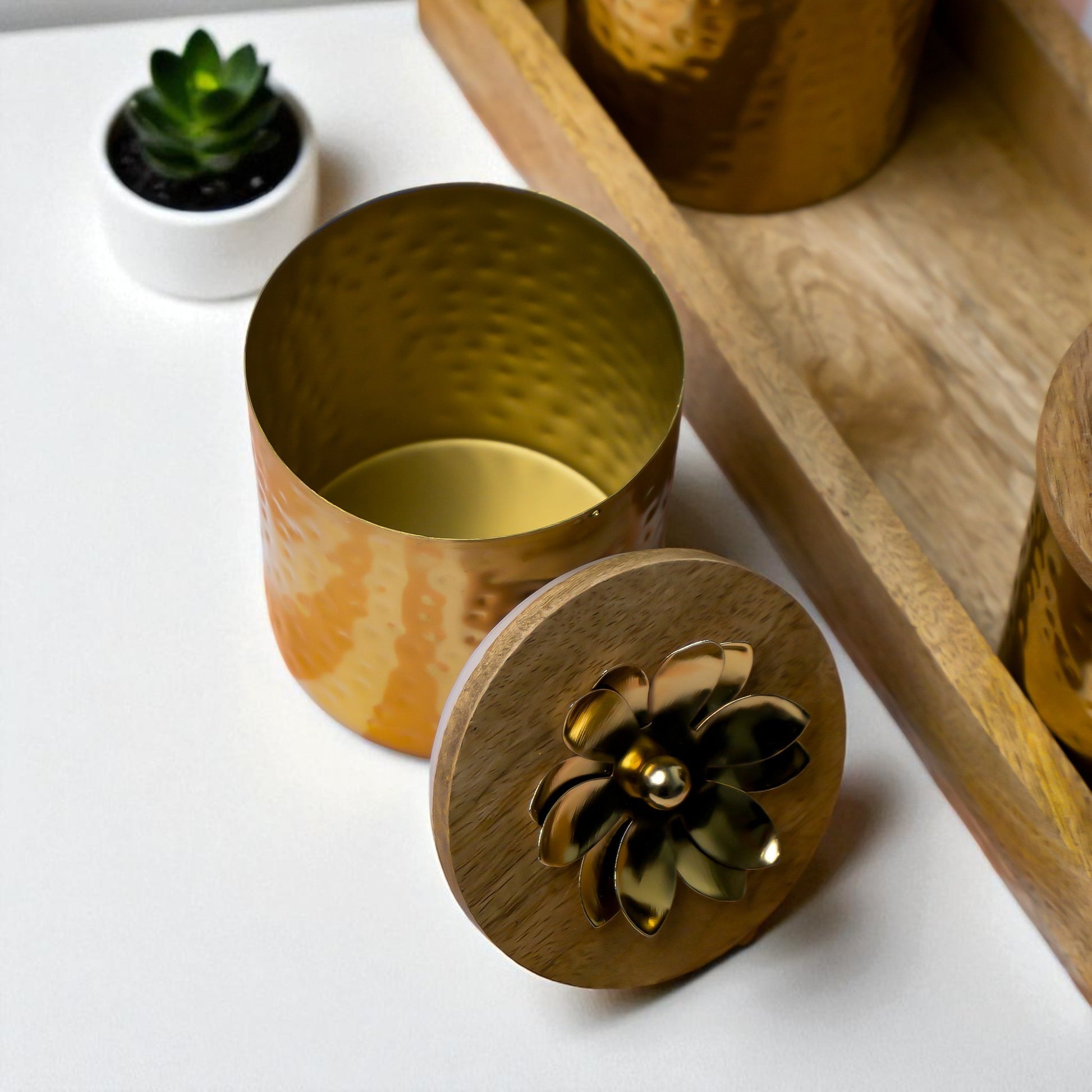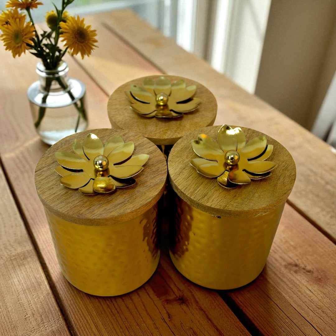 Add a touch of artisanal luxury to your home with the Golden Lotus Hammered Brass Storage Jar Set.