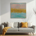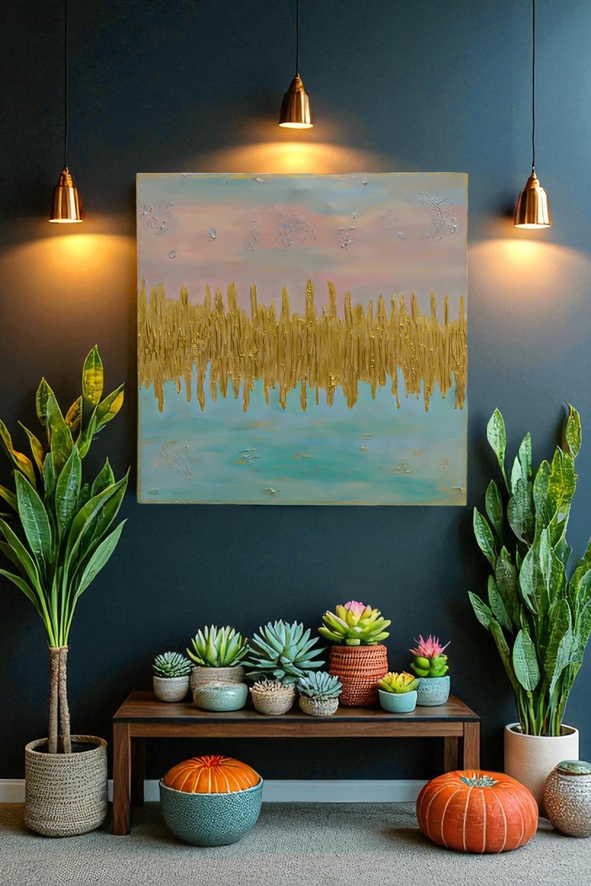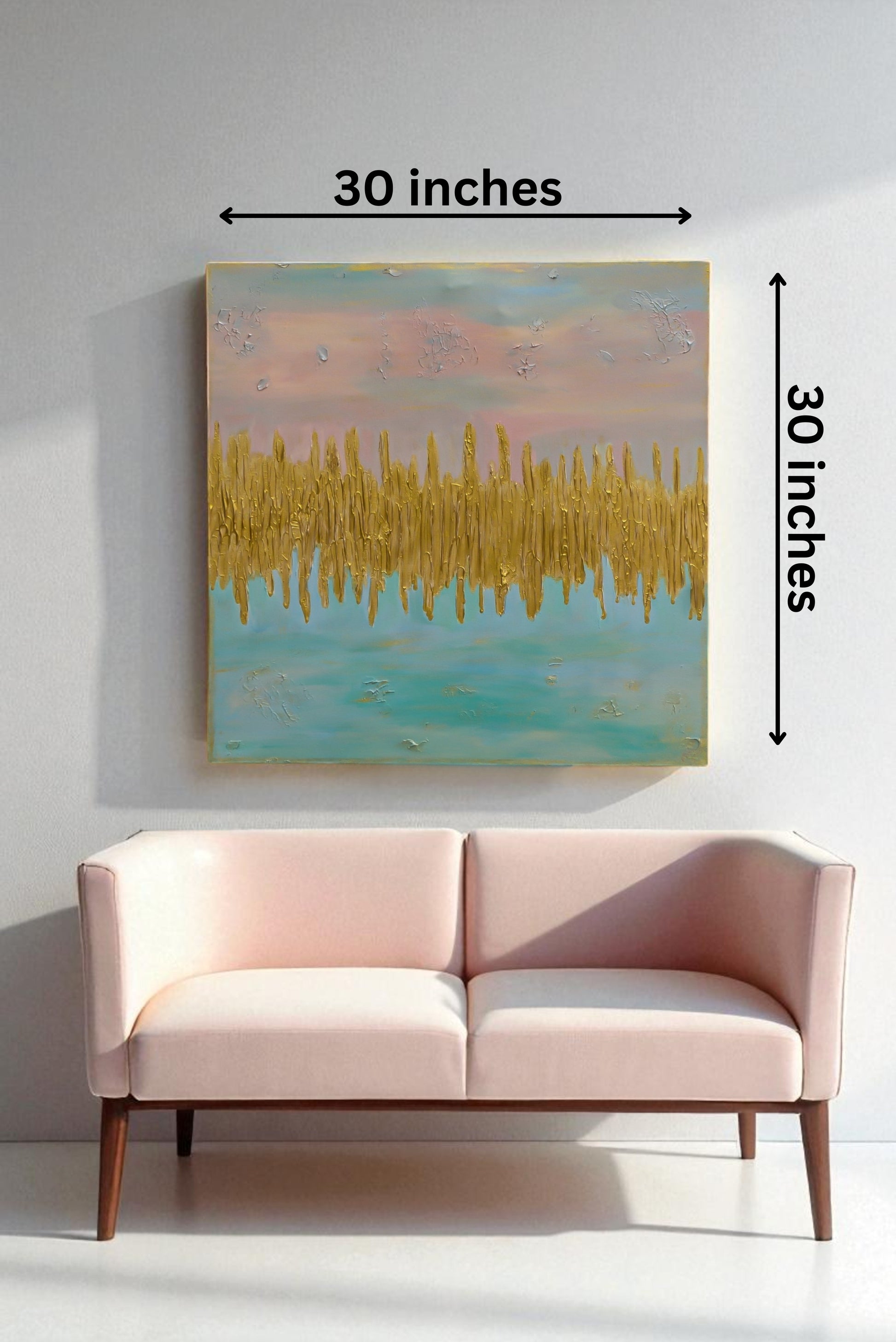 This handmade canvas painting features a striking golden textured pattern that resembles shimmering reflections on water at sunset. The warm gold stands boldly against the dreamy pastel backdrop of soft pinks and calming blues, creating a balance of energy and tranquility. The raised texture adds depth and dimension, making the artwork come alive as light plays across its surface. Perfect for adding elegance and warmth to any modern space, it symbolizes harmony, abundance, and serenity.