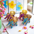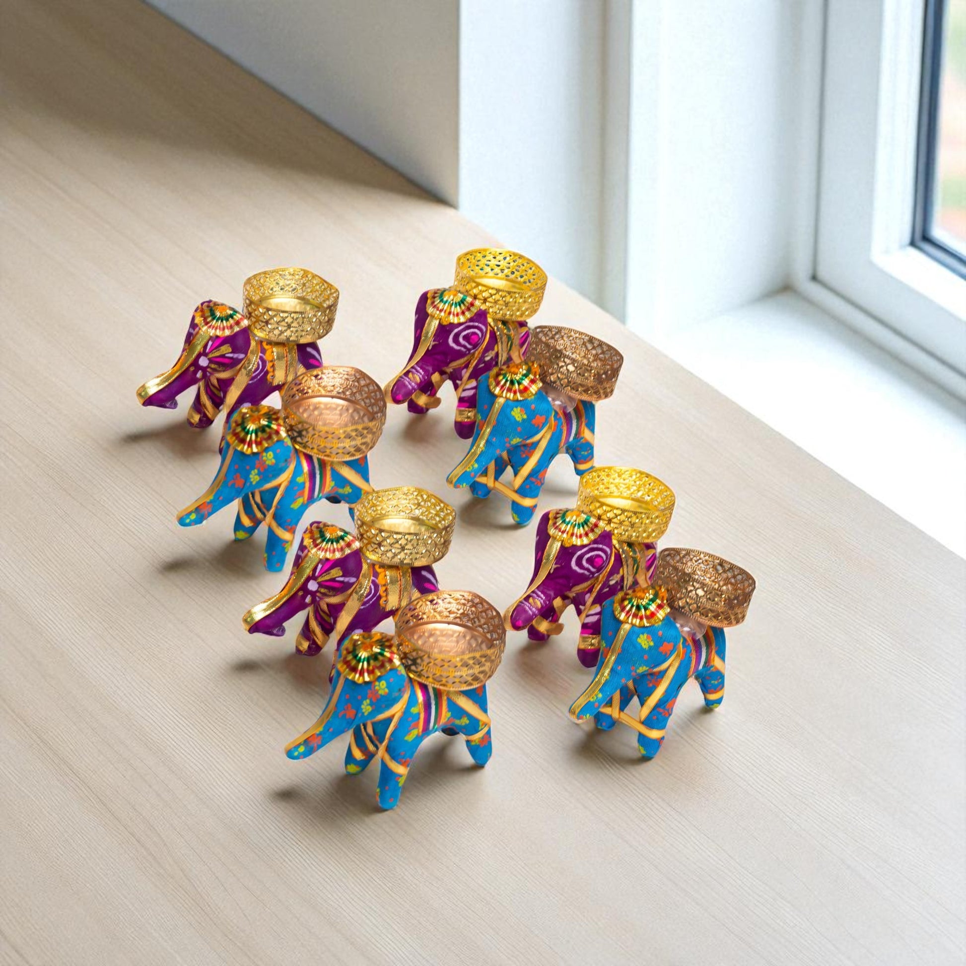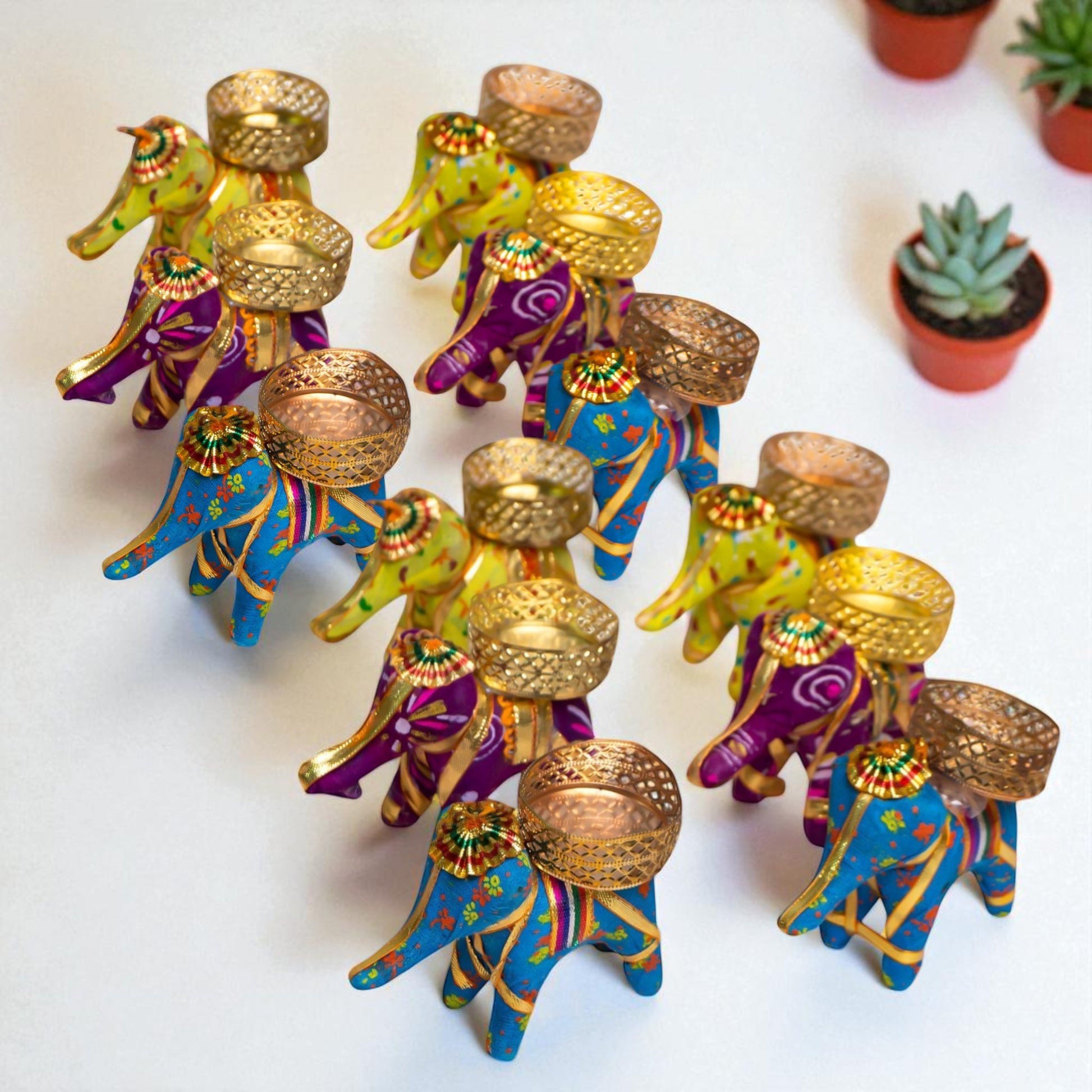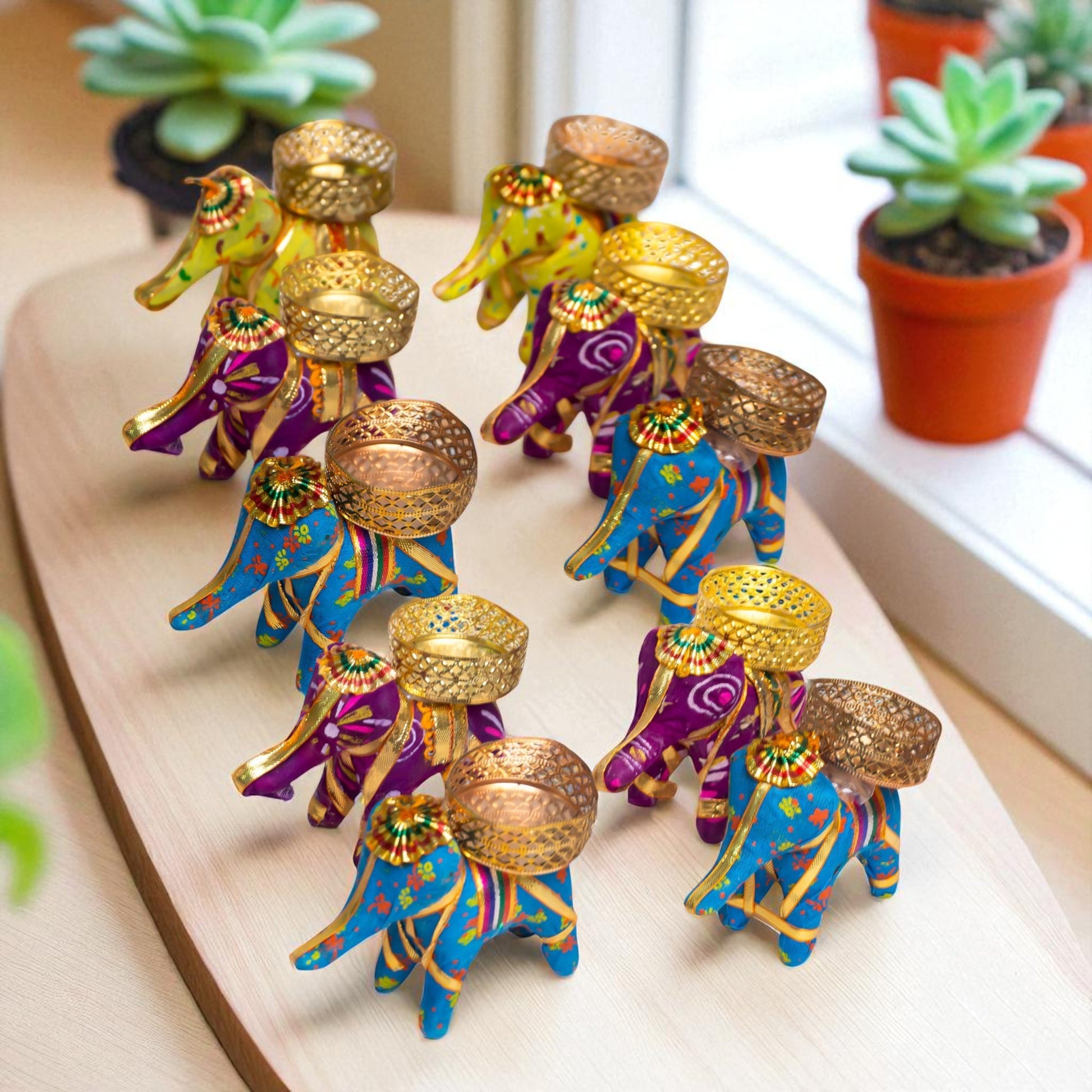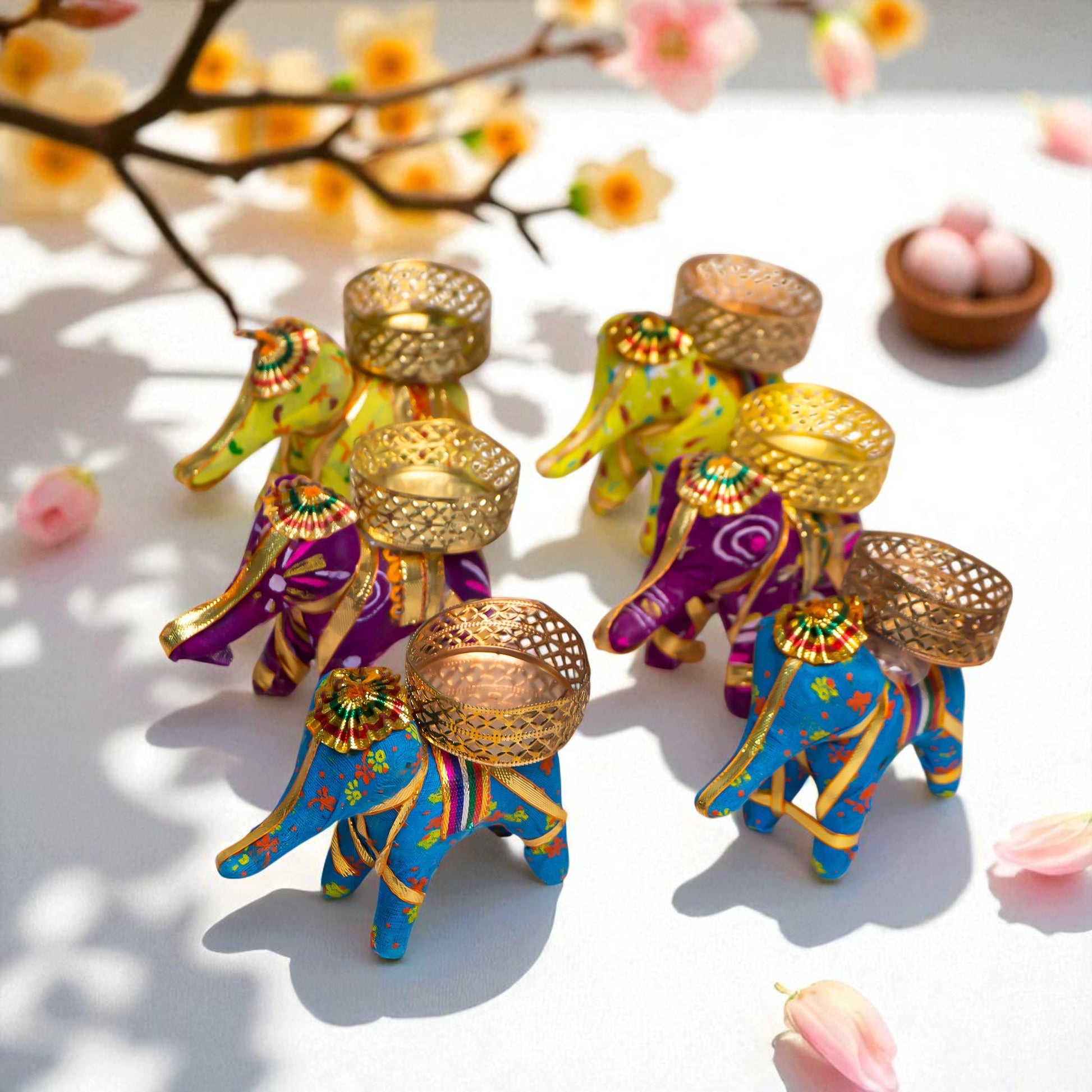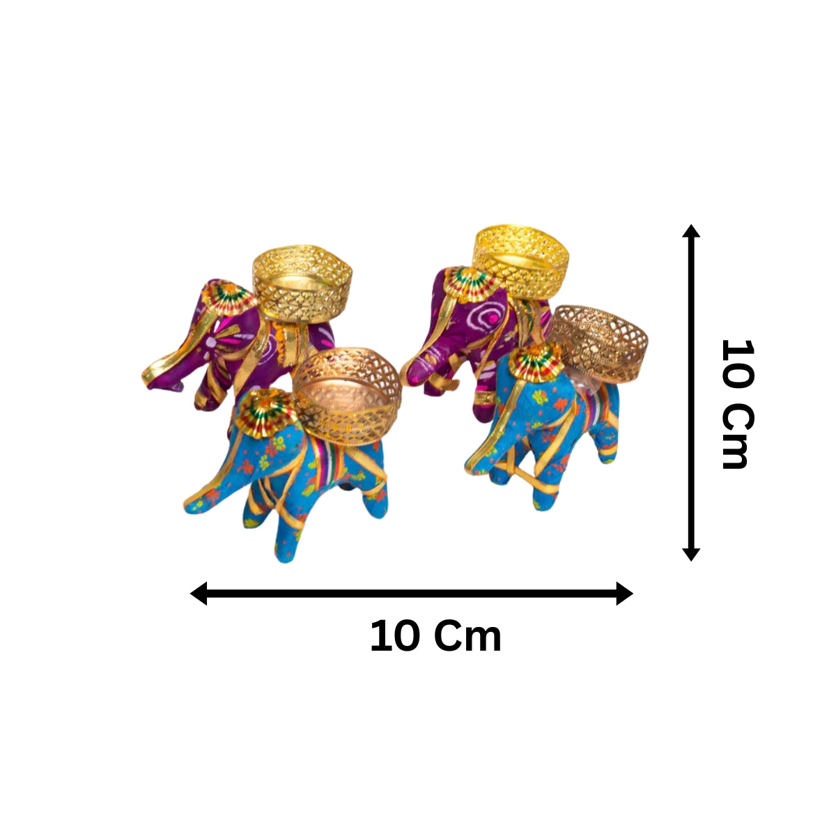 Illuminate your space with warmth and cultural character with these exquisite Handmade Elephant T-Light Holders. Made from fabric with a textured finish, each holder brings forth a unique blend of tradition, skill, and symbolism. Each holder has been beautifully textured, hand-painted by skilled artisans, and with rich, deep ethnic patterning and vibrant traditional colors, acknowledging India's cultural heritage. Ethnic diyas are considered to represent strength, wisdom, and good fortune. They can be used to adorn auspicious ceremonies and celebrations throughout the year, Indian festivals like Diwali, housewarmings, or pujas. The holders are designed to hold standard-sized tea light candles only.