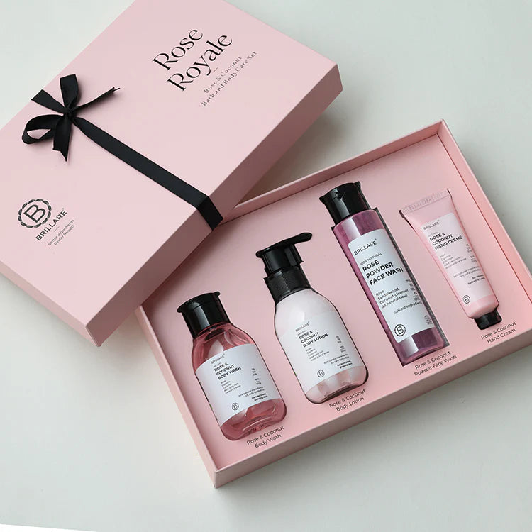 A luxurious rose-infused self-care gift box designed to pamper the skin with soothing hydration and a refreshing floral aroma. This elegant pink hamper includes a complete bath and body routine, beautifully arranged in premium packaging with a satin-finish ribbon—perfect for gifting on any special occasion.