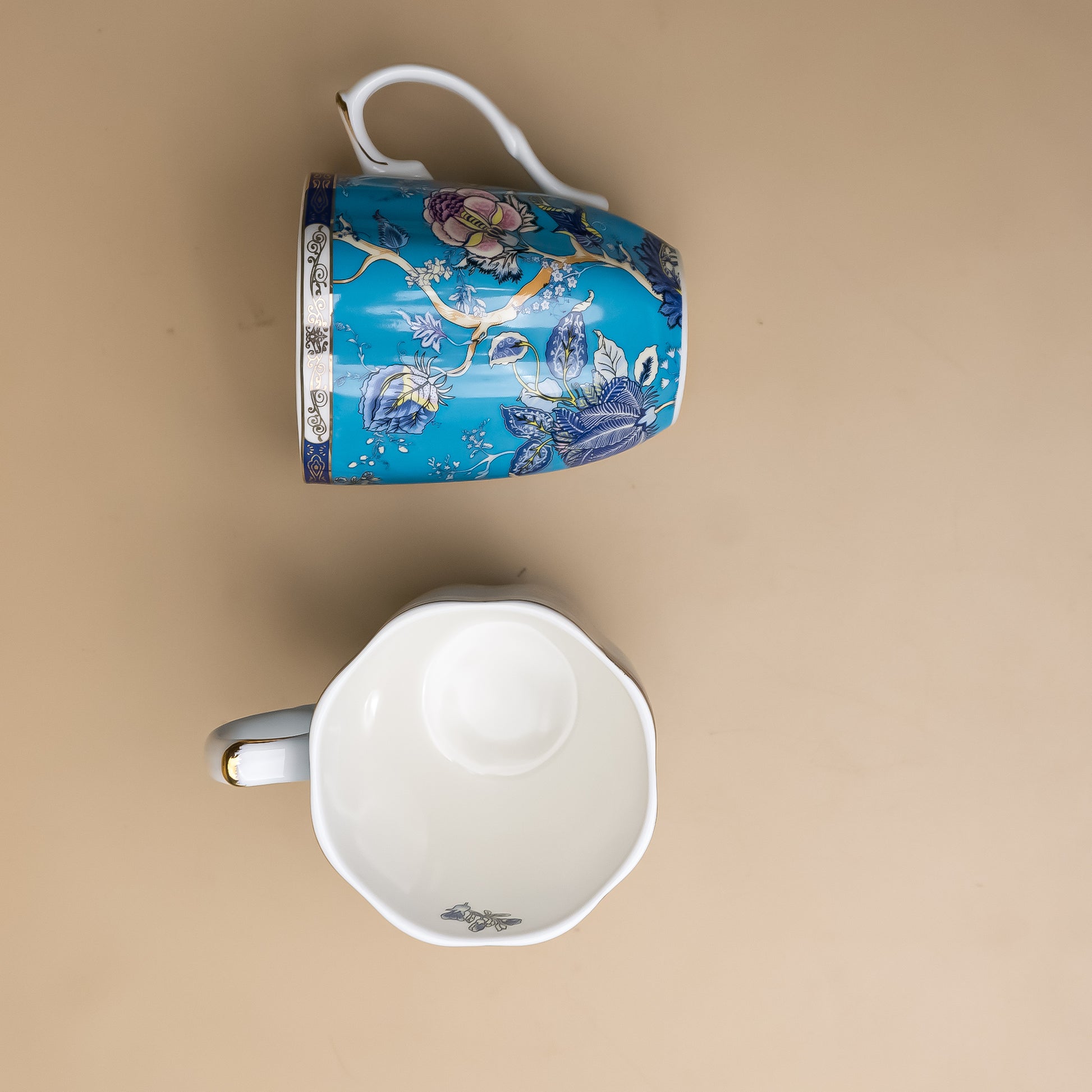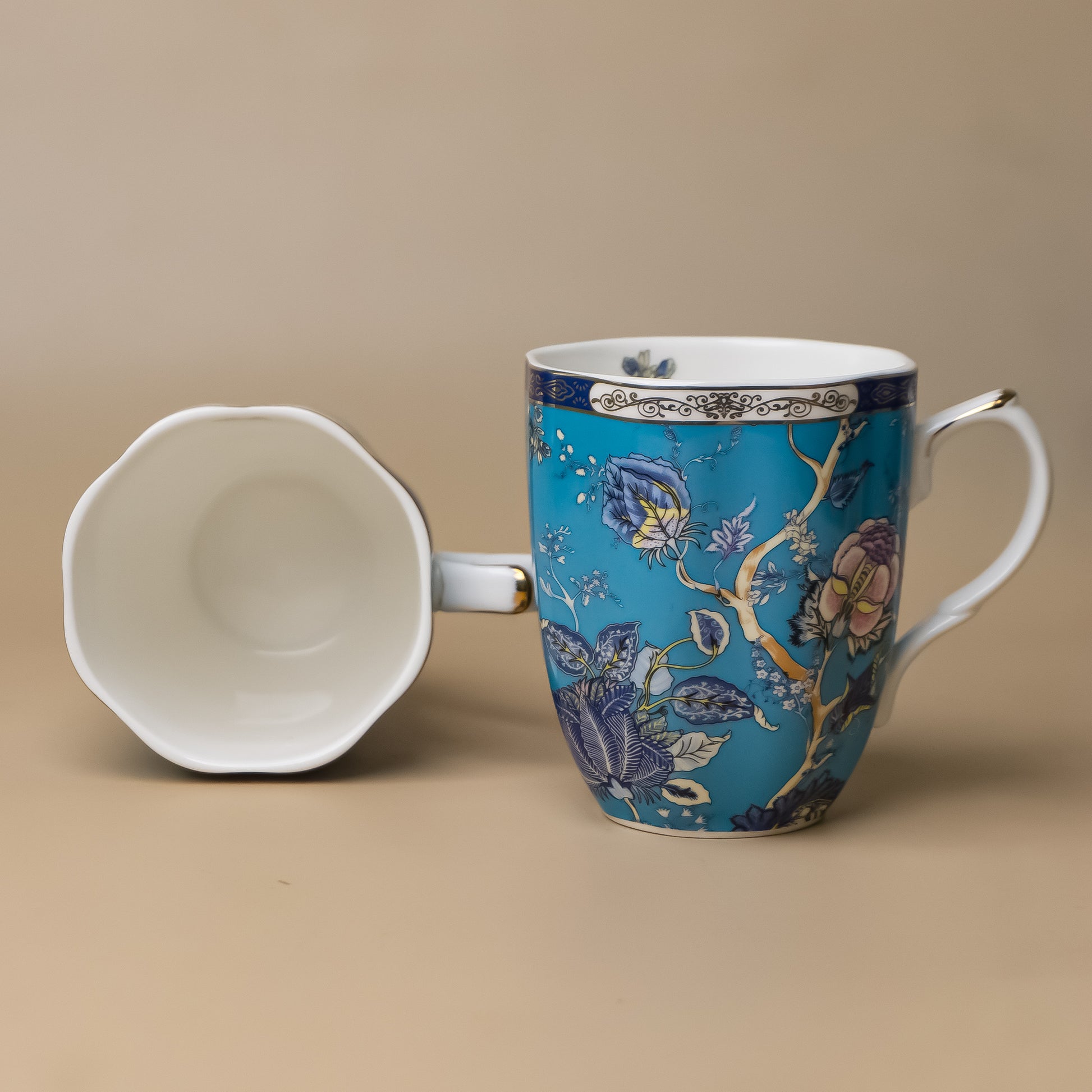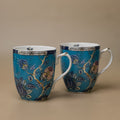 This elegant set of two ceramic mugs features a rich turquoise blue background with intricate floral and branch motifs, offering a blend of tradition and modernity. Presented in a satin-lined, green floral gift box, the set is perfect for tea or coffee lovers. Ideal for gifting or personal use, these mugs add charm and elegance to every sip, making them a thoughtful choice for any occasion.