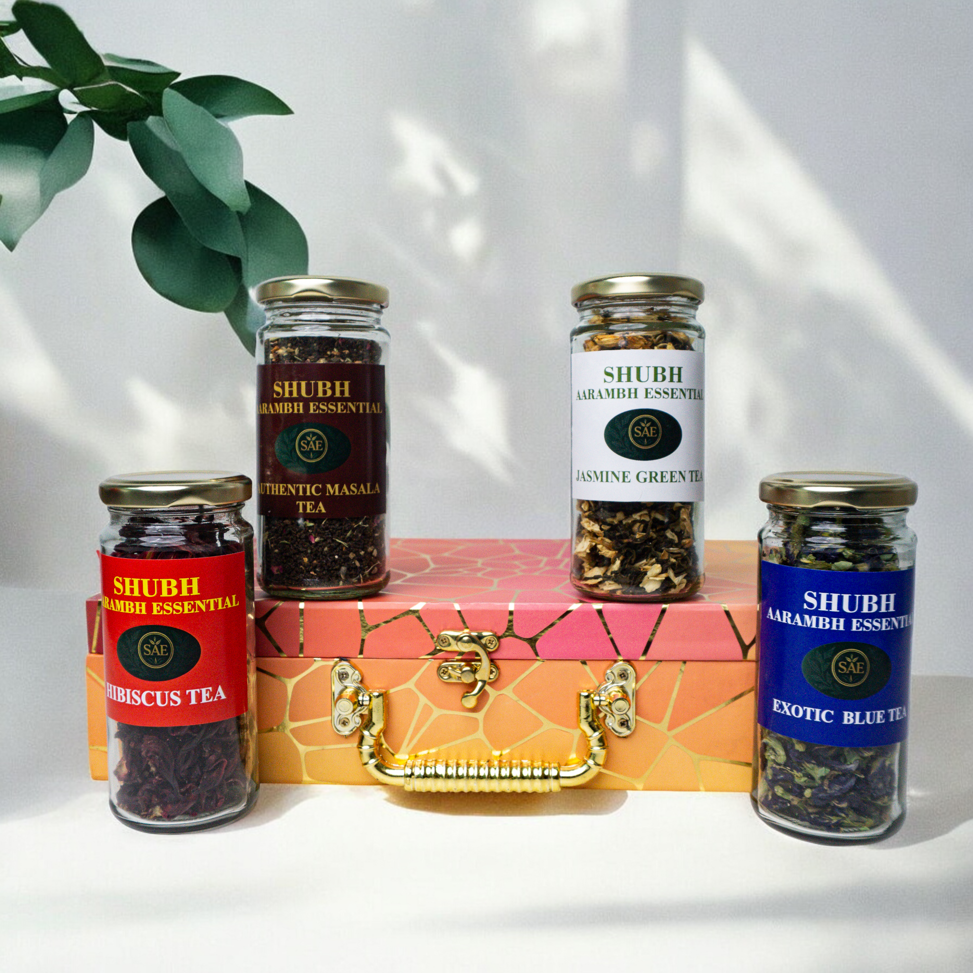 Indulge in a luxurious tea-tasting experience with the Shubh Aarambh Signature Tea Gift Box, featuring four exquisite blends beautifully packed in an elegant designer box. Each jar contains a unique flavour crafted from premium, handpicked ingredients—perfect for tea connoisseurs and gifting occasions.