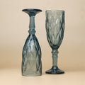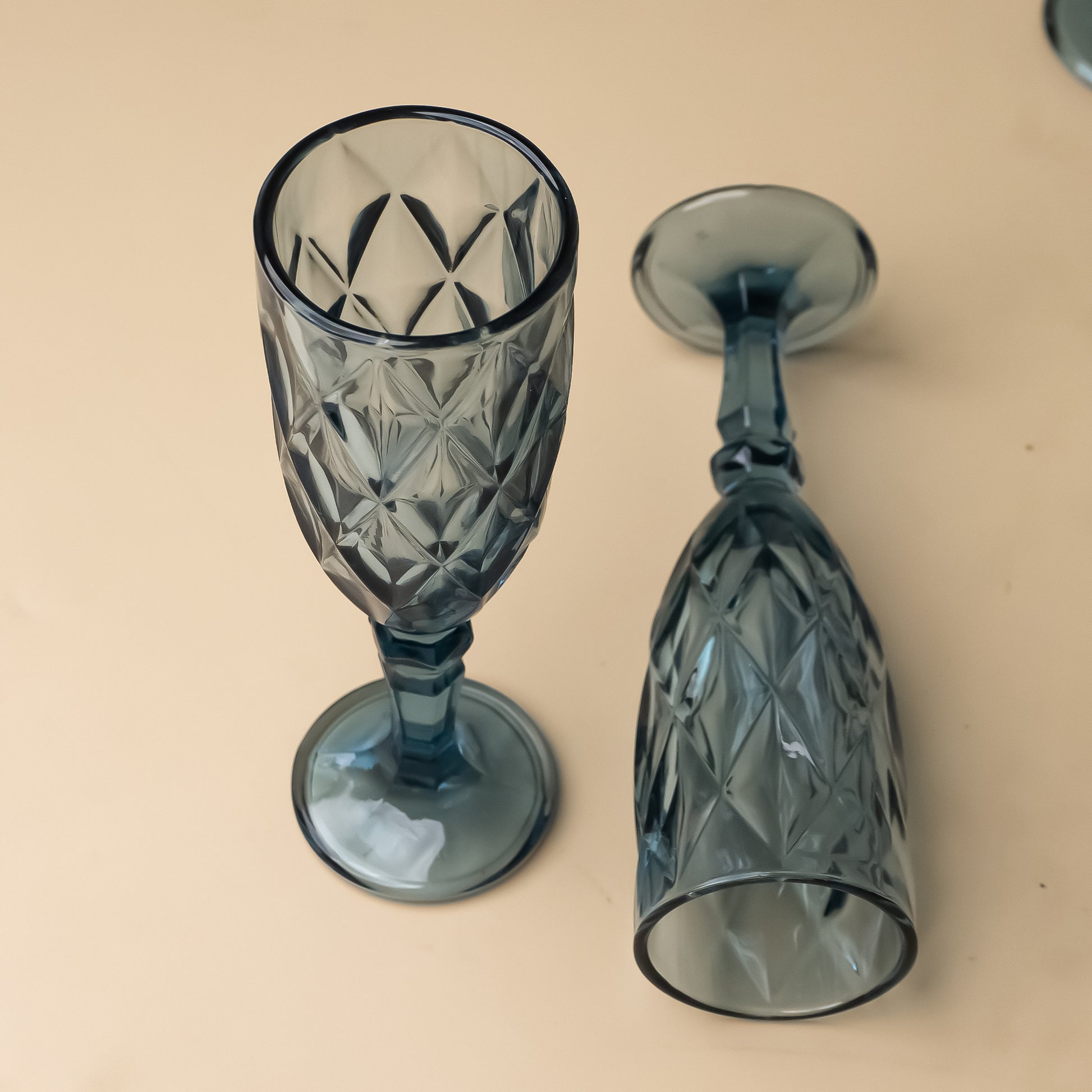 Simply elevate your drink service with this set of six smokey blue flute glasses complete with texture. The glasses offer a beautiful texture, making them a unique visual and tactile experience. Perfect for serving champagne, sparkling beverages, or upscale cocktails, these glasses add an even cooler and modern edge to your event or next special occasion.