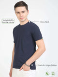 Elevate your eco-conscious fashion with our crew neck navy blue environmentally friendly t shirts. Made from organic materials and ethically produced, it's a wardrobe essential that combines style with sustainability, ensuring you look good and feel good. Our fabric comprises 60% pre-consumed cotton waste and 40% recycled PET bottle scrap, a testament to our commitment to environmental responsibility and contemporary style.