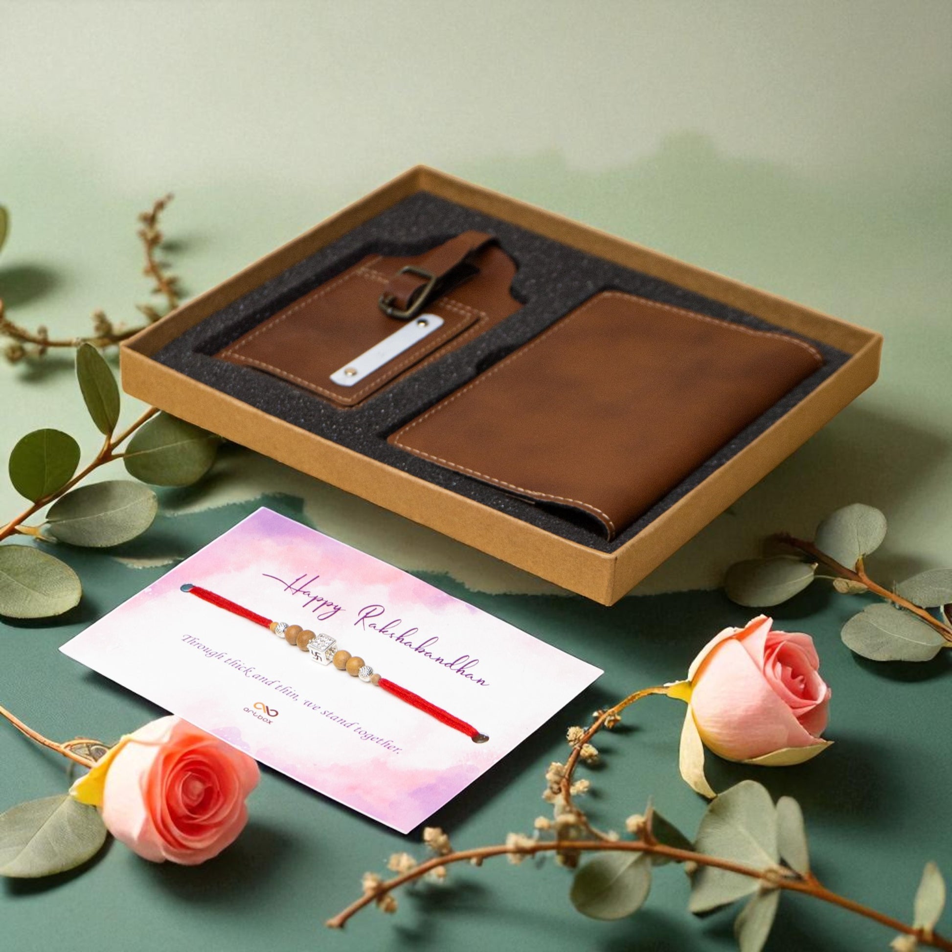 This features a stylish Rakhsh Bandhan hamper that caters to the characteristics associated with a modern gentleman by bringing together professional functionality, moments of indulgence, and self-care. The hamper will include the premium Bombay Shaving Company kit to enhance their grooming experience, an executive kit that comes with an ID card holder and passport holder for travel, an assorted pack of Sleepy Owl coffee, with a unique cork-bottomed mug (a perfect fit for him). There is also a Loyka almond brittle, plus another Rakhi, making it a thoughtful present for your brother or a male loved one during Raksha Bandhan.