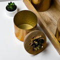 Simply amazing additions to one-of-a-kind spaces, balancing elegance and functionality in design. Made in metal with a golden finish, the three containers come with handcrafted lids resembling a lotus flower. The juxtaposition of the hammered metal texture adds a touch of luxurious artisan appeal, and the matte wood and gloss gold finish gives it a contemporary feel, perfect festive gift!
